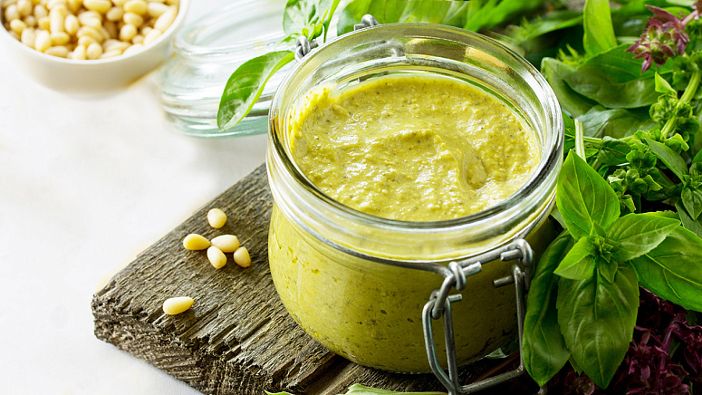 Знаменитое блюдо итальянской кухни – соус песто, в котором основным ингредиентом является базилик. В нашей интерпретации соуса используются только цельные растительные продукты. Ингредиенты базилик — 2 пучка; кешью — 1 ст.л; оливковое масло — 1–2 ст.л; тыквенные семечки — 1 ст.л; петрушка — 1 пучок; кедровые орехи — 1 ст.л; сушёный чеснок — 1 ч.л; авокадо — 1/2...