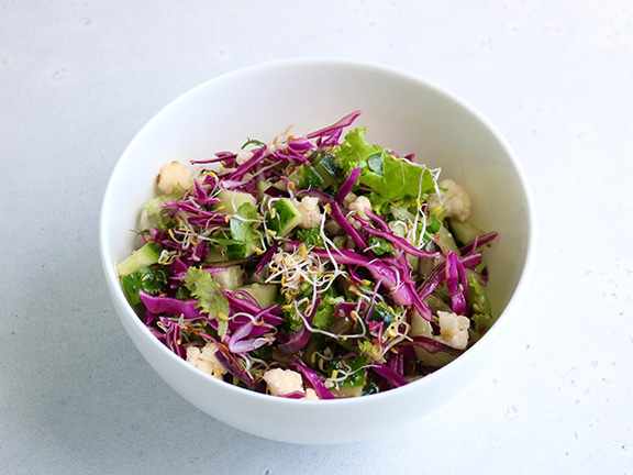 Сыроедческий хрустящий салат с кунжутным «майонезом» без масла и соли в качестве пикантного соуса. Способствует поддержанию работы системы детоксикации и улучшает здоровье микрофлоры кишечника.