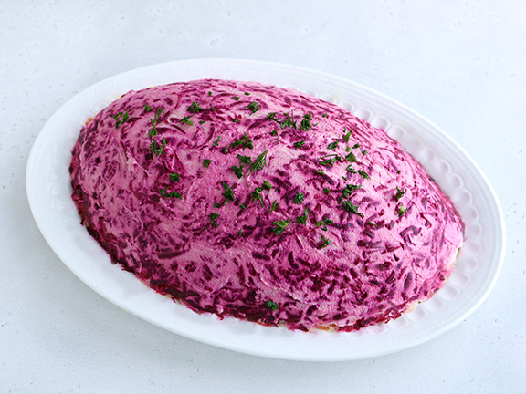 Знакомый с детства салат «Шуба» в оригинальной веганской интерпретации. Сыроедческая версия вдохновляет на то, чтобы готовить по данному рецепту в любое время года, несмотря на устоявшийся стереотип, что этот салат является зимним. Отсутствие термообработанных овощей делает блюдо более свежим, сочным и не менее полезным.