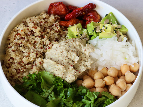 Хумус является сбалансированной закуской, которая может стать полноценным приёмом пищи, ведь знаменитая закуска из нута богата белками, жирами и сложными углеводами. Для большей сочности можно добавить клетчатку, а также безглютеновую лепешку.