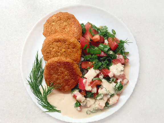 - С помощью кухонной доски: размять отваренный нут вилкой и переложить в тарелку; нарезать на мелкие кубики огурец и красный лук; мелко нарубить укроп; мелко нарвать водоросли нори; соединить все ингредиенты в тарелке и хорошо перемешать. Готово!