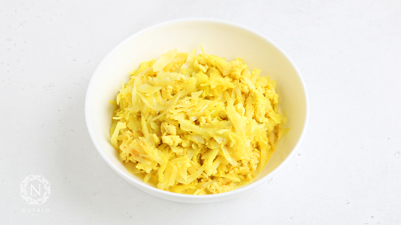- На доске размять тофу вилкой и переместить к капусте. Добавить соевое молоко и специи.