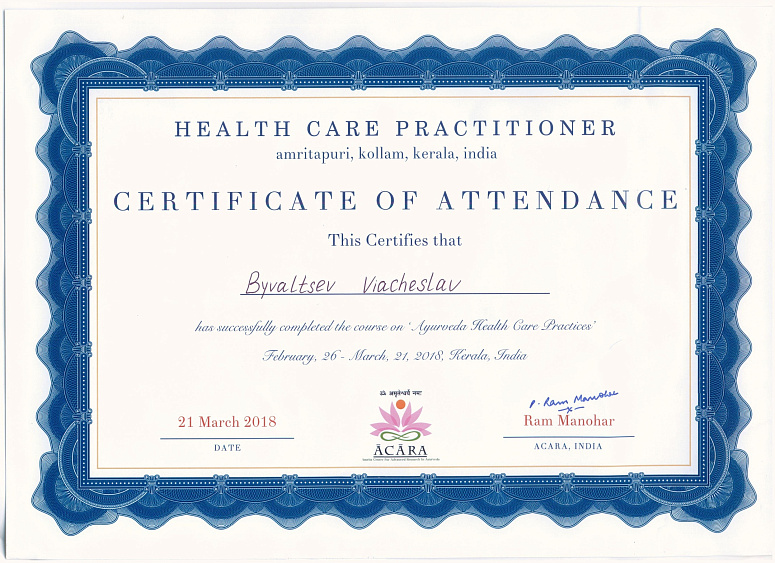 - С 2016 по 2021 год проходил многочисленные обучающие курсы по аюрведическому лечению в Индии (Керала).